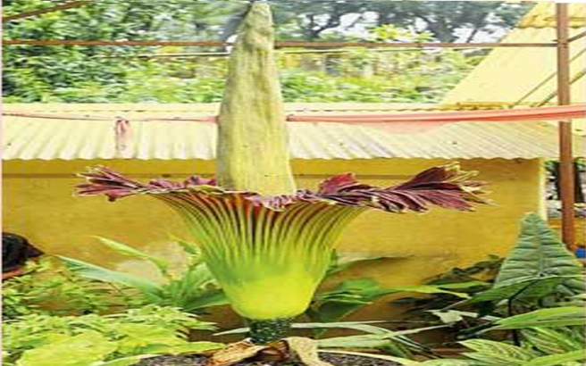 ജര്മനിയില് നിന്നാണ് ഇന്തൊനീഷ്യയിലെ സുമാത്രയിലെ നിത്യഹരിതവനങ്ങളില് കാണുന്ന ചെടി പേര്യയിലെ ബോട്ടാണിക്കല് ഗാര്ഡന് സമ്മാനമായി കിട്ടിയത്.വര്ഷങ്ങളുടെ ഇടവേളകളില് പൂക്കുന്ന പൂ വിരിയാന് ഏറെ ദിവസമായി ആളുകള് കാത്തിരിക്കുകയായിരുന്നു. പൂവാണെന്നു പറയാമെങ്കിലും ശാസ്ത്രലോകത്തെ പലരും ഇതിനെ പൂങ്കുലയെന്നാണ് വിളിക്കുന്നത്. കാരണം പൂവിന്റെ മേലാപ്പിനു ചുവട്ടിലായി അതിനെ പൊതിഞ്ഞ് ആയിരക്കണക്കിന് ആണ്, പെണ് പൂക്കളുള്ളതു തന്നെ. ഇന്തൊനീഷ്യന് വനങ്ങളില് കണ്ടുവരുന്ന റഫ്ലീഷ്യാ എന്ന സസ്യത്തിന്റെ പൂവാണ് ലോകത്തിലെ ഏറ്റവും വലിയ പൂവ്.