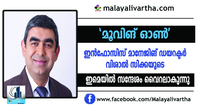 ഇൻഫോസിസ് മാനേജിങ് ഡയറക്ടർ സ്ഥാനത്തുനിന്നു രാജിവച്ച വിശാൽ സിക്ക സഹപ്രവർത്തകർക്ക് അവസാനം അയച്ച ഇമെയിൽ സന്ദേശം ശ്രദ്ധേയമാകുന്നു. ‘മൂവിങ് ഓൺ’ എന്ന തലക്കെട്ടോടെ തന്റെ ബ്ലോഗിലും അദ്ദേഹം തന്റെ സന്ദേശം പങ്കുവച്ചിട്ടുണ്ട്.