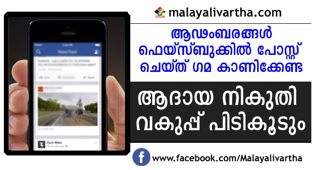 നികുതി വെട്ടിച്ച ആഢംബരങ്ങള് ഫെയ്സ്ബുക്കില് പോസ്റ്റ് ചെയ്തു ഗമകാണിക്കാമെന്നു ഇനി ആരും കരുതേണ്ട. കള്ളപ്പണം തടയാന് വ്യക്തികളുടെ സോഷ്യല് മീഡിയ അക്കൗണ്ടുകൾ നീരീക്ഷിക്കാൻ ആദായ നികുതി വകുപ്പ് തീരുമാനിച്ചു. ഫെയ്സ്ബുക്കില് പുതുതായി വാങ്ങിയ ആഡംബര കാറ്, വാച്ച്, തുടങ്ങിയവയുടെ വിവരങ്ങള് വെളിപ്പെടുത്തിയാൽ ഇന്കം ടാക്സ് ഡിപ്പാര്ട്ടിന്റെ പിടിവീഴും എന്നർത്ഥം.