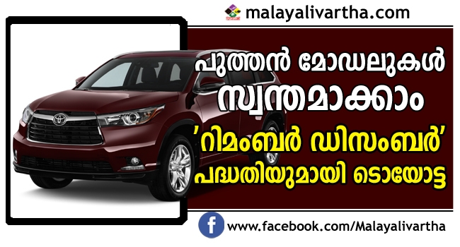 ഉപഭോക്താക്കള്ക്ക് മികച്ച ഓഫറുകളോടെ ടൊയോട്ടയുടെ മോഡലുകള് സ്വന്തമാക്കാന് അവസരം നല്കുന്ന 'റിമംബര് ഡിസംബര്' പദ്ധതിക്ക് തുടക്കമായി. വിലയുടെ 100 ശതമാനം വായ്പാ സൗകര്യം, 4.99 ശതമാനം പലിശയ്ക്ക് വായ്പ തുടങ്ങിയ ഓഫറുകള് ഈ സ്കീം വഴി ലഭിക്കും. 40,000 രൂപ മുതല് 90,000 രൂപവരെ ആനുകൂല്യങ്ങളും നേടാം. ഓഫര് ഡിസംബര് 31ന് സമാപിക്കും.