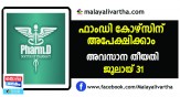 പരിയാരം മെഡിക്കല് കോളേജിൽ ഫാംഡി കോഴ്സിന് അപേക്ഷ ക്ഷണിച്ചു