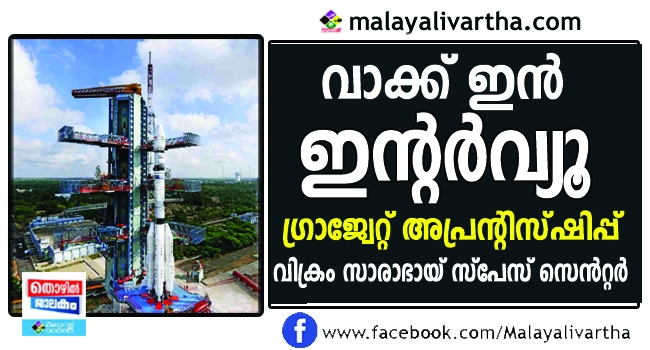 വിക്രം സാരാഭായ് സ്പേസ് സെന്ററില് ഗ്രാജ്വേറ്റ് അപ്രന്റിസ്ഷിപ്പ്: വാക്ക് ഇന് ഇന്റര്വ്യൂ.