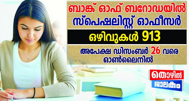 ബാങ്ക് ഓഫ് ബറോഡയിൽ സ്പെഷലിസ്റ്റ് ഓഫീസ് തസ്തികയിലെ 913 ഒഴിവുകളിലേക്ക് അപേക്ഷ ക്ഷണിച്ചു. ഡിസംബർ 26 വരെ ഓണ്ലൈനായി അപേക്ഷ സമർപ്പിക്കാം.ഒഴിവുകൾ ഇനി പറയും പ്രകാരം