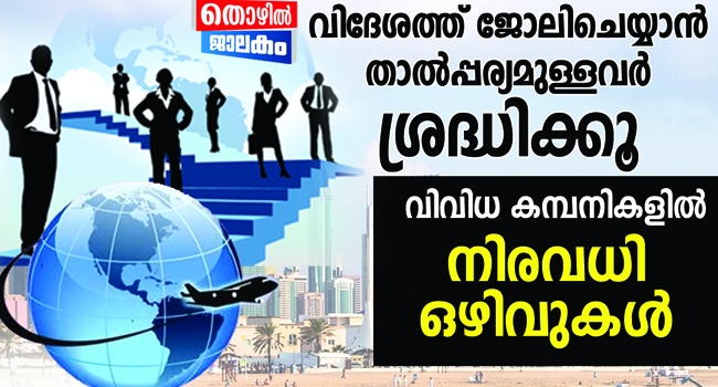 ദുബായ് ,അബുദാബി, അമേരിക്ക ,ആസ്ത്രേലിയ എന്നിവിടങ്ങളിലെ വിവിധ കമ്പനികളിൽ നിരവധി ഒഴിവുകൾക്ക് ഇപ്പോൾഅപേക്ഷിക്കാം. വിദേശജോലി സ്വപ്നം കാണുന്നവർക്ക് ഇതൊരു സുവർണാവസരമാണ്