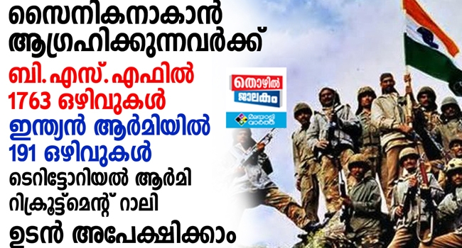 സൈനികനാകാൻ ആഗ്രഹിക്കുന്നവർക്ക് വളരെ സന്തോഷമുള്ള വാർത്ത. ബി.എസ്.എഫ് , ഇന്ത്യൻ ആർമി, ടെറിട്ടോറിയൽ ആർമി എന്നിവയിൽ നിരവധി ഒഴിവുകളാണ് ഇപ്പോൾ ഉള്ളത്. ബി.എസ്.എഫിൽ 1763 ഒഴിവുകൾ, ഇന്ത്യൻ ആർമിയിൽ 191 ഒഴിവുകൾ എന്നിവക്ക് പുറമെ ടെറിട്ടോറിയൽ ആർമി റിക്രൂട്ട്മെന്റ് റാലിയു നടത്തുന്നുണ്ട്. ഓരോ വിഭാഗത്തിന്റെയും വിശദാംശങ്ങൾ ഇങ്ങനെ..