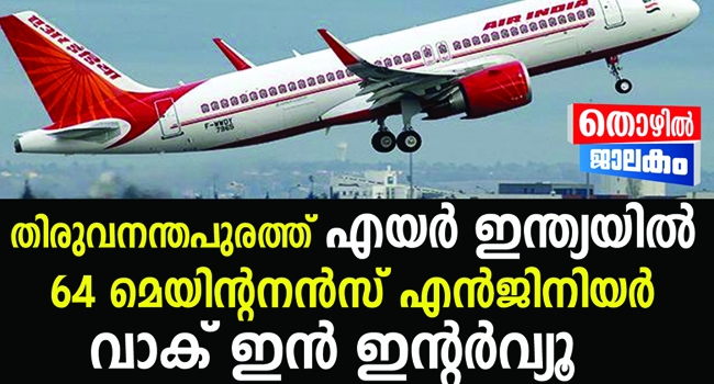 തിരുവനന്തപുരത്ത് എയർ ഇന്ത്യയിൽ 64 മെയിന്റനൻസ് എൻജിനിയർ എയർ ഇന്ത്യയിൽ വാക് ഇൻ ഇന്റർവ്യൂ എയർ ഇന്ത്യ എൻജിനിയറിംഗ് സർവീസസിൽ എയർക്രാഫ്റ്റ് മെയിന്റനൻസ് എൻജിനിയർമാരുടെ 70 ഒഴിവുകളിലേക്ക് അപേക്ഷ ക്ഷണിച്ചു. ഇതിൽ 64 ഒഴിവ് തിരുവനന്തപുരത്താണ്. കരാർ നിയമനമാണ്. വാക് ഇൻ ഇന്റർവ്യൂ വഴിയാണ് തെരഞ്ഞെടുപ്പ്. യോഗ്യത: ഫിസിക്സ്, കെമിസ്ട്രി, മാത്തമാറ്റിക്സ് പ്ലസ്ടു, എയർക്രാഫ്റ്റിൽ മെയിന്റനൻസ് ലൈസൻസും ഒരു വർഷത്തെ പ്രവൃത്തിപരിചയവും. പ്രായം: 2019 ജനുവരി ഒന്നിന് 55 കവിയരുത്. ഒബിസിക്കാർക്ക് മൂന്നു വർഷവും വിമുക്തഭടന്മാർക്ക് നിയമാനുസൃതവും ഉയർന്ന പ്രായത്തിൽ ഇളവ് ലഭിക്കും. അപേക്ഷ: അപേക്ഷാ ഫോമിനും കൂടുതൽ വിവരങ്ങൾക്കും www.airindia.in എന്ന വെബ്സൈറ്റ് സന്ദർശിക്കുക. അപേക്ഷ സ്വീകരിക്കുന്ന അവസാന തീയതി ഫെബ്രുവരി 11. ഹുബ്ബള്ളി എയർപോർട്ട് മൂന്നു വർഷത്തെ കരാർ നിയമനത്തിന് ഇനി പറയുന്ന തസ്തികകളിലേക്ക് അപേക്ഷ ക്ഷണിച്ചിട്ടുണ്ട്. 1 കസ്റ്റമർ ഏജന്റ് ബിരുദമാണ് അപേക്ഷിക്കാനുള്ള അടിസ്ഥാന യോഗ്യത. നല്ല കംപ്യുട്ടർ പരിജ്ഞാനം അത്യാവശ്യമാണ്. ബിരുദാന്തര ബിരുദമുള്ളവർക്ക് മുന്ഗണനയുണ്ടാകും. ഏതെങ്കിലും എയർപോർട്ടിൽ റിസർവേഷൻ ,ടിക്കറ്റിങ് , കമ്പ്യൂട്ടറൈസ്ഡ് പാസഞ്ചർ ചെക്ക് -ഇൻ /കാർഗോ കൈകാര്യം ചെയ്തുള്ള പരിചയം എന്നിവയുള്ളവർക്ക് മുൻഗണയുണ്ട്. ജനറൽ വിഭാഗത്തിന് 28 വയസ്സും OBC ക്കാർക്ക് - 31 വയസ്സുമാണ് പ്രായ പരിധി . SC/ST വിഭാഗത്തിൽ പെട്ടവർക്ക് 33 വയസ്സുവരെ ആപേക്ഷിക്കാം . 17,790/ രൂപ വരെ മാസശമ്പളം ഉണ്ടായിരിക്കും 2 ഹാൻഡി മാൻ / ഹാൻഡി വുമൺ തസ്തികയിൽ 06 ഒഴിവുകൾ പത്താം ക്ളാസ് ആണ് മിനിമം യോഗ്യത. ഇംഗ്ലീഷ് ,പ്രാദേശിക ഹിന്ദി എന്നിവ അറിഞ്ഞിരിക്കണം. ജനറൽ വിഭാഗത്തിന് 28 വയസ്സും OBC ക്കാർക്ക് - 31 വയസ്സുമാണ് പ്രായ പരിധി . SC/ST വിഭാഗത്തിൽ പെട്ടവർക്ക് 33 വയസ്സുവരെ ആപേക്ഷിക്കാം. താൽപ്പര്യമുള്ളവർ ഫെബ്രുവരി 10th ന് ഇന്റർവ്യൂവിനു ഹാജരാകണം. അഡ്രെസ്സ് Prof Kamala Shivappa Balekundri High school,Dr. Radhakrishnan Nagar,Gokul Road,HubballiDharward District.മേൽപ്പറഞ്ഞ തസ്തികകളിൽ ബെൽഗാവി എയർ പോർട്ടിലും ഒഴിവുകൾ ഉണ്ട് ഫെബ്രുവരി 10 ന് ഇന്റർവ്യൂവിന് ഹാജരാകേണ്ട അഡ്രസ് Project OfficeAirport authority of IndiaBelgavi AirportSambraPin - 591124