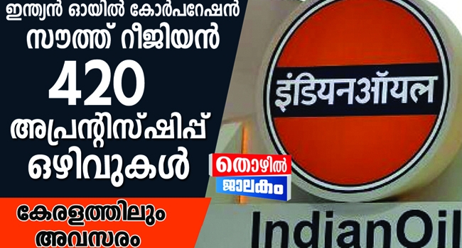 ഇന്ത്യന് ഓയില് കോര്പറേഷന് സൗത്ത് റീജിയന് വിവിധ വിഭാഗങ്ങളില് അപ്രന്റിസ്ഷിപ്പിന് അപേക്ഷ ക്ഷണിച്ചു. കേരളത്തിലുള്ളവർക്കും അപേക്ഷിക്കാം . ആകെ 420 ഒഴിവുകളാണുള്ളത്. കേരളം, തമിഴ്നാട്, പുതുച്ചേരി, കര്ണാടക, തെലങ്കാന, ആന്ധ്രാപ്രദേശ് എന്നിവിടങ്ങളിലാണ് അവസരം. കേരളത്തില് മാത്രം 56 ഒഴിവുകളുണ്ട്. താൽപ്പര്യമുള്ളവർ ഓണ്ലൈനായാണ് അപേക്ഷിക്കേണ്ടത്.