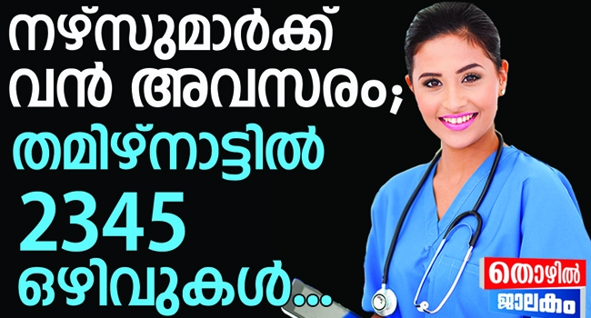 തമിഴ്നാട് സര്ക്കാരിനുകീഴിലുള്ള മെഡിക്കല് സര്വീസസ് റിക്രൂട്ട്മെന്റ് ബോര്ഡ് നഴ്സുമാരുടെ 2345 ഒഴിവുകളിലേക്ക് പരസ്യ നമ്പർ : 01/MRB/2019 പ്രകാരം അപേക്ഷ ക്ഷണിച്ചു. കരാര് നിയമനമാണ്. രണ്ട് വര്ഷത്തിനുശേഷം സ്ഥിരപ്പെടാന് സാധ്യതയുണ്ട്. തമിഴ്ഭാഷ പഠിച്ച ഇതര സംസ്ഥാനക്കാര്ക്കും അപേക്ഷിക്കാം. ജനറല് വിഭാഗക്കാര്ക്കുള്ള 634 ഒഴിവുകളിലേക്ക് ഇവരെ പരിഗണിക്കും . 14000 രൂപയാണ് മാസ ശമ്പളം . 2019 ജൂലായ് 1-ന് 18 നും 32 നും ഇടയിൽ പ്രായമുള്ളവർക്ക് അപേക്ഷിക്കാം .പരീക്ഷാ ഫീസ്: 700 രൂപയോഗ്യത: അപേക്ഷകർക്ക് തമിഴ്നാട് നഴ്സസ് ആന്ഡ് മിഡ് വൈവ്സ് കൗണ്സിലിന്റെ സ്ഥിര രജിസ്ട്രേഷന് സര്ട്ടിഫിക്കറ്റുണ്ടാവണം. എസ്.എസ്.എല്.സി. തലത്തിലോ പ്ലസ്ടു തലത്തിലോ തമിഴ് ഭാഷ പഠിച്ചിരിക്കണം. അല്ലെങ്കില് തമിഴ്നാട് പി.എസ്.സി. നടത്തുന്ന തമിഴ് ഭാഷാ പരീക്ഷ ജയിച്ചിരിക്കണംവനിതകള്ക്ക് മൂന്ന് വര്ഷത്തില് കുറയാത്ത ജനറല് നഴ്സിങ് പരിശീലനവും ആറ് മാസത്തെ മിഡൈ്വഫറി പരിശീലനവും ആണ് യോഗ്യത . തമിഴ്നാട് സര്ക്കാര് അംഗീകൃത സ്ഥാപനങ്ങളില്നിന്നുള്ള സര്ട്ടിഫിക്കറ്റ് ഉണ്ടായിരിക്കണം പുരുഷന്മാര്ക്ക് ജനറല് നഴ്സിങ്ങില് മൂന്ന് വര്ഷത്തെ പരിശീലനവും സൈക്യാട്രിയില് ആറ് മാസത്തെ പരിശീലനവും ആവശ്യമാണ്. ഒബ്ജക്ടീവ് രീതിയില് 100 മാര്ക്കിനുള്ള 200 ചോദ്യങ്ങള് ആണ് പരീക്ഷക്ക് ഉണ്ടാകുക. ഒ.എം.ആര്. പരീക്ഷ ആയിരിക്കും .. .ഇംഗ്ലീഷിലായിരിക്കും പരീക്ഷ. രണ്ടര മണിക്കൂർ ആയിരിക്കും പരീക്ഷാ ദൈര്ഘ്യം...ചുരുങ്ങിയത് 35 ശതമാനം മാര്ക്കാണ് ജയിക്കാന് വേണ്ടത്. ഇന്റര്വ്യു ഉണ്ടാവില്ല. ചെന്നൈ (കോഡ് 01), തിരുച്ചിറപ്പള്ളി (കോഡ് 02), മധുര (കോഡ് 03), തിരുനെല്വേലി (കോഡ് 04), കോയമ്പത്തൂര് (കോഡ് 05) എന്നിവിടങ്ങളിൽ പരീക്ഷാ കേന്ദ്രങ്ങള് ഉണ്ട്. അപേക്ഷ: www.mrb.tn.gov.in എന്ന വെബ്സൈറ്റില് ഓണ്ലൈനായി അപേക്ഷിക്കണം. അപേക്ഷയില് ഫോട്ടോയും ഒപ്പും അപ്ലോഡ് ചെയ്യണം. ഓണ്ലൈന് അപേക്ഷ സ്വീകരിക്കുന്ന അവസാന തീയതി: ഫെബ്രുവരി 27.വെബ്സൈറ്റിലെ വിജ്ഞാപനം പൂര്ണമായി വായിച്ച് യോഗ്യത ഉറപ്പാക്കി മാത്രം അപേക്ഷിക്കുക.