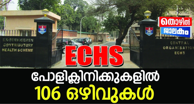 എക്സ് സർവീസ്മെൻ കോൺട്രിബ്യുട്ടറി ഹെൽത്ത് സ്കീം പ്രകാരമുള്ള പോളിക്ലിനിക്കുകളിൽ 106 ഒഴിവുകളിലേക്ക് അപേക്ഷ ക്ഷണിച്ചു. തിരുവനന്തപുരം ഹെഡ്ക്വാർട്ടറിനു കീഴിൽ കൊല്ലം, പത്തനംതിട്ട, കിളിമാനൂർ,കൊട്ടാരക്കര, ചങ്ങനാശ്ശേരി, റാന്നി, മാവേലിക്കര, തിരുവനന്തപുരം, നാഗർകോവിൽ, തൂത്തുക്കുടി എന്നിവിടങ്ങളിലെ പോളിക്ലിനിക്കുകളിലാണ് അവസരം. കരാർ നിയമനമാണ്. ഏതാനും തസ്തികകൾ വിമുക്ത ഭടർക്കു മാത്രമായി സംവരണം ചെയ്തിട്ടുണ്ട്. ഒഴിവുകൾ 1.ഓഫീസർ ഇൻ ചാർജ് : യോഗ്യത ബിരുദം. സായുധ സേനയിൽ നിന്ന് വിരമിച്ച ഓഫീസര്മാരായിരിക്കണം. ആരോഗ്യ പരിപാലന സ്ഥാപനത്തിൽ അഞ്ചു വർഷത്തെ പ്രവർത്തി പരിചയം വേണം. 2. മെഡിക്കൽ സ്പെഷ്യലിസ്റ് : എം.ഡി / എം.എസ് മൂന്നു വർഷത്തെ പ്രവർത്തിപരിചയം.3. മെഡിക്കൽ ഓഫീസർ : എംബിബിഎസ്, ഇന്റേൺഷിപ്പിനു ശേഷം മൂന്നു വർഷത്തെ പ്രവർത്തിപരിചയം. 4. ഡെന്റൽ ഓഫീസർ : ബി ഡി എസ്, ഇന്റേൺഷിപിന് ശേഷം മൂന്നു വർഷത്തെ പ്രവർത്തിപരിചയം. 5. ഡെന്റൽ ഹൈജീനിസ്റ്റ് : പ്ലസ് ടു സയൻസ്/ തത്തുല്യം, ഡെന്റൽ ഹൈജീനിസ്റ്റ്/ ഡെന്റൽ മെക്കാനിക് കോഴ്സിൽ രണ്ടു വർഷത്തെ ഡിപ്ലോമ. സായുധ സേനയിൽ ക്ലാസ് 1 DH / DORA കോഴ്സ്, അഞ്ചു വർഷത്തെ പ്രവർത്തി പരിചയം.6 . റേഡിയോഗ്രാഫർ : റേഡിയോഗ്രാഫർ ഡിപ്ലോമ/ ക്ലാസ് 1 (സായുധ സേനകളിൽ നിന്ന്), അഞ്ചുവർഷത്തെ പ്രവർത്തിപരിചയം.7. ഫിസിയോതെറാപിസ്റ്റ് : ഫിസിയോതെറാപ്പി ഡിപ്ലോമ ക്ലാസ് 1 (സായുധ സേനകളിൽ നിന്ന്), അഞ്ചുവർഷത്തെ പ്രവർത്തിപരിചയം.8. ഫാർമസിസ്റ്റ് : ബി ഫാം അല്ലെങ്കിൽ പ്ലസ് ടുസയൻസ് (ഫിസിക്സ്, കെമിസ്ട്രി, ബയോളജി), ഫാർമസിയിൽ ഡിപ്ലോമ, ഫർമസിസ്റ്റ് രജിസ്ട്രേഷൻ, മൂന്നു വർഷത്തെ പ്രവർത്തി പരിചയം. 9. നഴ്സിങ് അസിസ്റ്റന്റ് (വിമുക്ത ഭടർ മാത്രം) സായുധ സേനകളിൽ നിന്ന് ക്ലാസ് 1നഴ്സിങ് അസിസ്റ്റന്റ് കോഴ്സ്.10. ലബോറട്ടറി അസിസ്റ്റന്റ് : ഡി.എം.എൽ. ടി/ സായുധ സേനകളിൽ നിന്ന് ക്ലാസ് 1 ലാബ്ടെക് കോഴ്സ്, അഞ്ചു വർഷത്തെ പ്രവർത്തിപരിചയം. 11. ലബോറട്ടറി ടെക്നിഷ്യൻ : യോഗ്യത ബിഎസ്സി (മെക്കാക്കൽ ലാബ് ടെക്നോളജി) അല്ലെങ്കിൽ എസ് എസ് എൽ സി /പ്ലസ് ടുവും മെഡിക്കൽ ലാബ് ടെക്നോളജിയിൽ ഡിപ്ലോമയും ലാബ് അസിസ്റ്റന്റ് ആയി മൂന്നു വർഷത്തെ പ്രവർത്തിപരിചയം വേണം . 12. ഡ്രൈവർ : യോഗ്യത എട്ടാം ക്ലാസ് സായുധ സേനയിൽ നിന്ന് ക്ലാസ് 1 ഡ്രൈവർ, ലൈറ്റ് മോട്ടോർ വെഹിക്കിൾ, ഡ്രൈവിംഗ് ലൈസൻസ് അഞ്ചു വർഷത്തെ പ്രവർത്തി പരിചയം. 13. പ്യൂൺ : സായുധ സേനയിൽ ജി ഡി ട്രേഡ്, അഞ്ചു വർഷത്തെ സർവീസ് . 14. സഫായിവാല : സാക്ഷരനായിരിക്കണം. അഞ്ചു വർഷത്തെ പ്രവർത്തി പരിചയം. 15. ചൗക്കിദാർ (വിമുക്ത ഭടർ മാത്രം): സായുധ സേനയിൽ ജി.ഡി ട്രേഡ് 16. ഐ. ടി നെറ്റ്വർകിങ്, കമ്പ്യൂട്ടർ ആപ്പ്ലിക്കേഷനിൽ ഡിപ്ലോമ/ സർട്ടിഫിക്കറ്റ് / തത്തുല്യം, രണ്ടു വർഷത്തെ പ്രവർത്തിപരിചയം. 17. ഡാറ്റ എൻട്രി ഓപ്പറേറ്റർ (വിമുക്ത ഭടർ മാത്രം): ബ