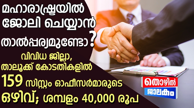 മഹാരാഷ്ട്രയിലെ വിവിധ ജില്ലാ, താലൂക്ക് കോടതികളില് സീനിയര് സിസ്റ്റം ഓഫീസര്, സിസ്റ്റം ഓഫീസര് ഒഴിവുകളിലേക്ക് അപേക്ഷ ക്ഷണിച്ചു. ആകെ 199 ഒഴിവുകളുണ്ട്