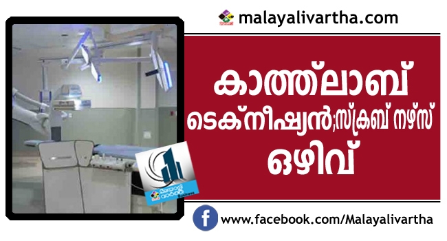 കാത്ത്ലാബ് ടെക്നീഷ്യന്, കാത്ത്ലാബ് സ്ക്രബ് നഴ്സ്, ലാബ് ടെക്നീഷ്യന്, ഡേറ്റാ എന്ട്രി ഓപ്പറേറ്റര് തസ്തികകളിലേക്കാണ് നിയമനം