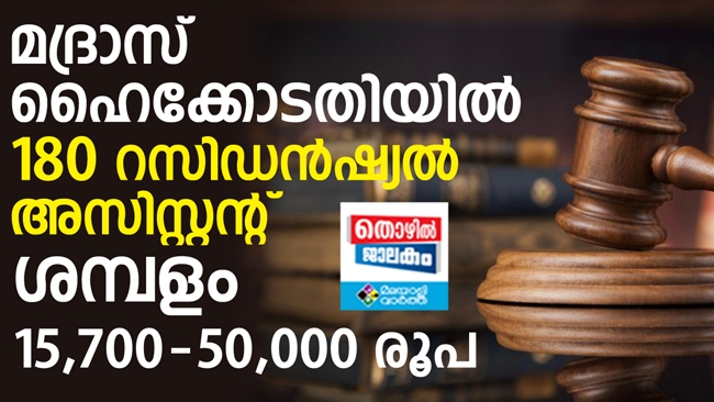 മദ്രാസ് ഹൈക്കോടതിയില് റെസിഡന്ഷ്യല് അസിസ്റ്റന്റിന്റെ ഒഴിവുകളിലേക്ക് അപേക്ഷ ക്ഷണിച്ചു. 180 ഒഴിവുണ്ട്. തമിഴ്/ഇംഗ്ലീഷ് ഭാഷകള് അറിയുന്നവര്ക്ക് മുന്ഗണനയുണ്ട് . താല്പര്യമുള്ള ഉദ്യോഗാർത്ഥികൾ ജൂണ് 12 നു മുൻപ് അപേക്ഷിക്കണം