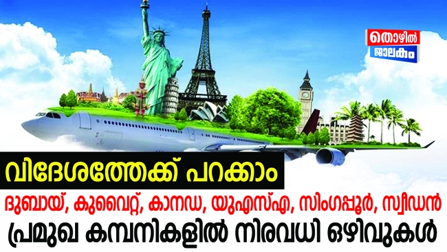 ദുബായ്, കുവൈറ്റ്, കാനഡ, യുഎസ്എ, സിംഗപ്പൂർ, സ്വീഡൻ - പ്രമുഖ കമ്പനികളിൽ മികച്ച ജോലികളിലേക്ക് ഇപ്പോൾ അപേക്ഷിക്കാം. ഇവിടെ കൊടുത്തിട്ടുള്ള കമ്പനി വെബ്സൈറ്റുകളിൽ നിന്ന് അതാത് കമ്പനികളെ കുറിച്ചുള്ള വിശദവിവരങ്ങൾ ലഭിക്കും . അവ നോക്കി അനുയോജ്യമായ കമണികളിലേക്ക് ഉടൻ തന്നെ അപേക്ഷകൾ അയക്കാം