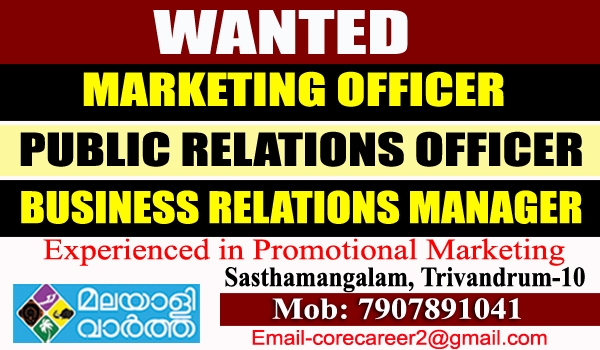 മാര്ക്കറ്റിംഗ് മാനേജര്, മാര്ക്കറ്റിംഗ് ഓഫീസര്, പബ്ലിക് റിലേഷന്സ് മാനേജര് എന്നിവരെ ടീം മലയാളി വാര്ത്തയിലേക്ക് ആവശ്യമുണ്ട്