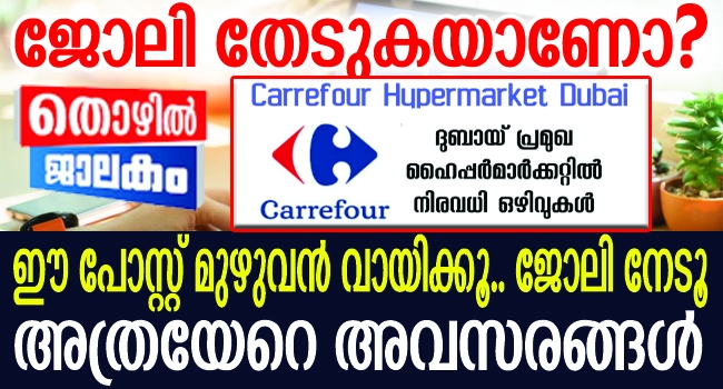 ഇന്ത്യയ്ക്ക് പുറത്ത് നല്ലൊരു ജോലി ആഗ്രഹിക്കുന്നവർക്ക് സുവർണാവസരം carrefour ഹൈപ്പർ മാർക്കറ്റിൽ നിരവധി ഒഴിവുകളിലേക്ക് സ്റ്റാഫുകളെ നിയമിക്കുന്നു. കമ്പനി നേരിട്ട് നടത്തുന്ന ഇന്റർവ്യൂ ആണ്. അതുകൊണ്ടുതന്നെ ഇതിൽ ആർക്കും നിങ്ങൾ യാതൊരുവിധ ചാർജുകളും നൽകേണ്ട ആവശ്യമില്ല. ഏജൻസിയുടെ സഹായമില്ലാതെ നേരിട്ട് ഗൾഫിൽ നല്ലൊരു ജോലി നേടാം.