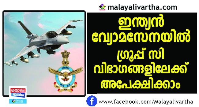 ഇന്ത്യൻ സേനയിലെ മൂന്നു പ്രമുഖ വിഭാഗങ്ങളിൽ ഒന്നാണ് ഇന്ത്യൻ വ്യോമസേന. ലോകത്തിലെ ഏറ്റവും വലിയ നാലാമത്തെ വായുസേനയാണ് ഇന്ത്യയുടേത് . ഇതിനു കീഴിൽ വരുന്ന സൗത്ത് വെസ്റ്റേൺ എയർ കമാൻഡ് വിവിധ ഒഴിവുകളിലേക്ക് അപേക്ഷ ക്ഷണിച്ചു. ഗ്രൂപ്പ് സി തസ്തികകളിലായി 54 ഒഴിവുകളാണുള്ളത്. 18 നും 25 നുമിടയിൽ പ്രായമുള്ളവർക്ക് ഈ തസ്തികയിലേക്ക് അപേക്ഷിക്കാവുന്നതാണു. www.indianair force.nic.in എന്ന വെബ്സൈറ്റിൽ നൽകിയിരിക്കുന്ന മാതൃകയിൽ ആണ് അപേക്ഷ ഫോറം തയ്യാറാക്കേണ്ടത്. ഏപ്രിൽ 14 നു മുൻപായി അപേക്ഷിക്കണം.
