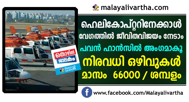 പ്രമുഖ ഹെലികോപ്റ്റർ സർവീസ് കമ്പനിയായ പവൻ ഹാൻസിൽ കമ്പനി സെക്രട്ടറി , ജനറൽ മാനേജർ തുടങ്ങി നിരവധി ഒഴിവുകൾ