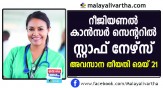 തിരുവനന്തപുരത്തെ റീജണല് കാന്സര് സെന്ററില് സ്റ്റാഫ് നഴ്സ് തസ്തികയിലേക്ക് അപേക്ഷ ക്ഷണിക്കുന്നു