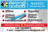 ടീം മലയാളിവാര്ത്തയിലേക്ക് എഡിറ്റര്മാരെയും, ജേണലിസ്റ്റുമാരെയും, ഡിജിറ്റല് ഡിസൈനേഴ്സിനെയും, മാര്ക്കറ്റിംഗ് സ്റ്റാഫിനെയും ആവശ്യമുണ്ട്.വാര്ത്താലോകത്ത് സാമൂഹിക പ്രതിബദ്ധതയോടെ താങ്കള്ക്കും പങ്കാളിയാക...