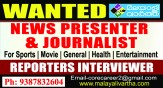 മലയാളിവാർത്ത , മെട്രോമാറ്റിനി ഗ്രൂപ്പിലേക്ക് പരിചയ സമ്പന്നരായ ജേർണലിസ്റ്റുകളെ ആവശ്യമുണ്ട്.. വ്യത്യസ്ത വിഷയങ്ങളിൽ വാർത്താധിഷ്ഠിത പ്രോഗ്രാമുകൾ അവതരിപ്പിക്കാൻ കഴിവുള്ളവർക്ക് അവസരം