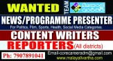 ടീം മലയാളിവാര്ത്തയിലേക്ക് പൊളിറ്റിക്സ് ,സിനിമ, സ്പോർട്സ് ,ബിസിനസ് ,ഹെൽത്ത് & വെൽനെസ്സ് തുടങ്ങിയ വിഷയങ്ങൾ തയ്യാറാക്കുന്നതിനായി പ്രോഗ്രാം അവതാരകർ, ന്യൂസ് പ്രെസന്റേഴ്സ് കണ്ടന്റ് റൈറ്റേഴ്സ്, റിപ...