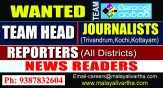 ടീം മലയാളിവാര്ത്തയിലേക്ക് ടീം ഹെഡ്, ജേർണലിസ്റ്റുകൾ, റിപ്പോർട്ടർമാർ, വീഡിയോ അവതാരകർ, ന്യൂസ് റീഡേഴ്സ് എന്നിവരെ ആവശ്യമുണ്ട്.. വെട്ടിച്ചുരുക്കലുകളോ, കൂട്ടിച്ചേര്ക്കലുകളോ ഇല്ലാതെ, വാര്ത്തകൾ വളച്ചൊടിക്കാതെ നേരിനൊപ്പം നിലയുറപ്പിച്ച മലയാളിവാര്ത്ത എഡിറ്റോറിയല് ടീം വികസിപ്പിക്കുകയാണ്....അതിൽ നിങ്ങൾക്കും ഞങ്ങളോടൊപ്പം ചേരാം