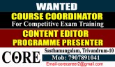 മത്സരപ്പരീക്ഷാ പരിശീലന രംഗത്ത് തിരുവനന്തപുരം കേന്ദ്രമായി പ്രവര്ത്തിക്കുന്ന കോര് ഗ്രൂപ്പിലേക്ക് കോഴ്സ് കോര്ഡിനേറ്റര്മാരെയും, മത്സരപരീക്ഷാ പരിശീലനത്തിനുള്ള മെറ്റീരിയല്സ് തയ്യാറാക്കുന്നതിന് എഡിറ്റര്മാരെയും ആവശ്യമുണ്ട്