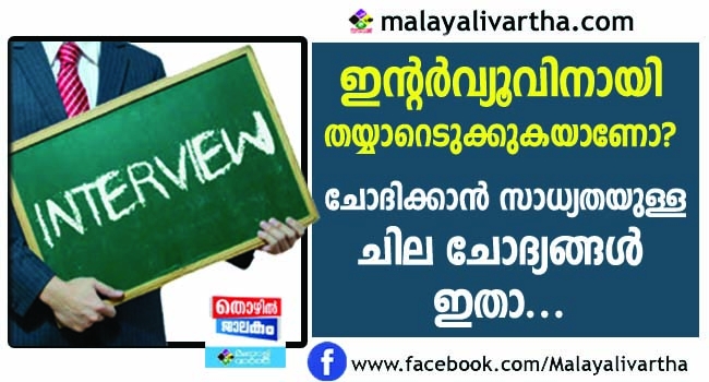 എന്തുകൊണ്ട് ഈ ജോലി തെരെഞ്ഞെടുത്തു ? ഞങ്ങളുടെ കമ്പനിയെക്കുറിച്ച് നിങ്ങള്ക്കെന്തറിയാം? നിങ്ങളെക്കുറിച്ച് പറയൂ... ഇത്തരം ചോദിക്കാവുന്ന ചോദ്യങ്ങള് കണ്ടെത്തി ഉത്തരം തയ്യാറാക്കി പരിശീലിക്കണം.
