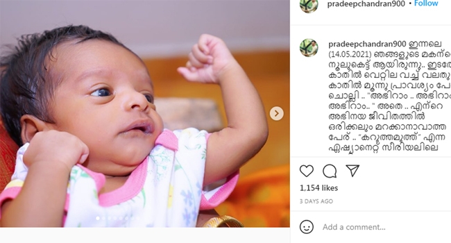 ഇൻസ്റ്റഗ്രാമിൽ പങ്കുവച്ച കുഞ്ഞിന്റെ ചിത്രത്തോടൊപ്പമുള്ള കുറിപ്പിലാണ് താരം ഇക്കാര്യം വെളിപ്പെടുത്തിയത്. എന്റെ ജീവിതത്തിലെ അവിസ്മരണീയമായ കഥാപാത്രവും നാഴികക്കല്ലുമായിന്നു ഈ കഥാപാത്രമെന്നും അതുകൊണ്ട് തന്നെ ഈ പേര് എന്നും എപ്പോഴും എന്റെ ജീവിതത്തിന്റെ ഒരു ഭാഗമാകാൻ ആഗ്രഹിച്ചുവെന്നും മകന്റെ പേര് വെളിപ്പെടുത്തി കൊണ്ട് പ്രദീപ് ചന്ദ്രൻ സോഷ്യൽ മീഡിയയിൽ കുറിച്ചു.