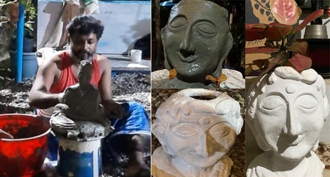 ബുദ്ധന്റെ തലയിൽ ചെടി വളർന്നങ്ങിനെ നിൽക്കുന്ന ഒരു ചെടിച്ചട്ടി കണ്ടിട്ട് വില ചോദിച്ചു -2000/- രൂപയും കൊറിയർ ചാർജ് 150/- ഉം !! ബുദ്ധന്റെ ഒരു പ്രതിമ ചോദിച്ചപ്പോ 4500/- ഒപ്പം കൊറിയർ ചാര്ജും !!നേരെ കടയിൽപോയി കൊറച്ചു സിമന്റ് മേടിച്ചു . ടെറസിൽ കയറി പൊട്ടിക്കിടന്ന കൊറച്ചു കമ്പി സംഘടിപ്പിച്ചു !