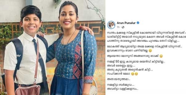 കഴിഞ്ഞ ദിവസം മകനൊടൊപ്പം പ്രവേശനോത്സവത്തിനു സ്കൂളിലെത്തിയതിന്റെ ചിത്രങ്ങൾ കഴിഞ്ഞ ദിവസം മലയാളത്തിന്റെ പ്രിയ നടി നവ്യ നായർ സോഷ്യൽ മീഡിയയിൽ പങ്കുവയ്ക്കുകയുണ്ടായി. ഇത് വൈറലായി മരുകയായിരുന്നു. നിരവധിപേരാണ് നവ്യയുടെ പോസ്റ്റിനു താഴെ കമന്റുകളുമായി എത്തിയത്. ഇതിൽ ചിലത് പരിഹാസത്തോടെയുള്ളതായിരുന്നു. ഇപ്പോഴിതാ, ഇത്തരം മോശം കമന്റുകളുമായി എത്തിയവരോടുള്ള പ്രതികരണമായി ഒരു രസികന് പോസ്റ്റ് പങ്കുവച്ചിരിക്കുകയാണ് നടൻ അരുൺ പുനലൂർ എന്ന യുവാവ്.