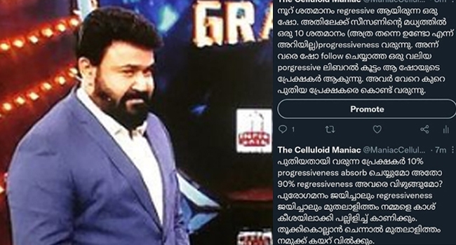 അത്തരത്തിൽ സോഷ്യൽ മീഡിയ പേജുകളിൽ വരുന്ന കുറിപ്പുകൾ നിസാരമല്ല. "നൂറ് ശതമാനം റിഗ്രെസിവ് ( പിന്തിരിപ്പൻ) ആയിരുന്ന ഒരു ഷോ. അതിലേയ്ക്ക് സീസണിന്റെ മധ്യത്തിൽ ഒരു പത്തു ശതമാനം അത്ര തന്നെ ഉണ്ടോ എന്നറിയില്ല, പ്രോഗ്രെസിവ്നെസ് ( പുരോഗമനം ) വരുന്നു.
