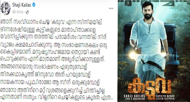 'കടുവ'യിലെ വാക്കുകൾ മുറിവേല്പിച്ചു എന്ന് കാട്ടി അച്ഛനമ്മമാരുടെ കുറിപ്പുകൾ കാണാനിടയായി. നിങ്ങൾക്ക് ലോകത്തിലേറ്റവും വിലപ്പെട്ടത് നിങ്ങളുടെ മക്കളാണെന്നും അവർക്ക് വേണ്ടിയാണ് നിങ്ങൾ ജീവിക്കുന്നതെന്നും മനസിലാക്കിക്കൊണ്ടുതന്നെ പറയട്ടെ....മാപ്പ്. നിങ്ങൾക്കുണ്ടായ മനോവിഷമത്തിന് ഈ വാക്കുകൾ പരിഹാരമാകില്ല എന്നറിഞ്ഞുകൊണ്ടുതന്നെ ഒരിക്കൽക്കൂടി ക്ഷമാപണം എന്നു പറഞ്ഞുകൊണ്ടാണ് ഷാജി കൈലാസ് കുറിപ്പ് അവസാനിപ്പിക്കുന്നത്.