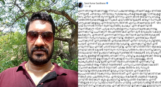 'എന്തായാലും തകർക്കൽ ശ്രമങ്ങൾ നടക്കട്ടെ. പാറയിൽ അടിക്കുന്ന കൂടം ഉപയോഗിച്ച് മേഘരൂപത്തെ തകർക്കാം എന്നത് നിങ്ങളുടെ വെറും വ്യാമോഹമെന്ന് മാത്രം പറയട്ടെ. പ്രണയബന്ധങ്ങളിൽ ഞാൻ തേടിയത് തനിച്ചിരിക്കുമ്പോലെ എനിക്ക് ഞാനായി ഇരിക്കാനുള്ള ഇടമായിരുന്നു. ഇപ്പോഴും ആ തേടൽ തുടരുന്നുണ്ട്. അങ്ങനെ ഒരു ഇടം വെറും മിഥ്യ മാത്രമാണ് എന്ന തിരിച്ചറിവാണ് ഓരോ ബന്ധങ്ങളും സമ്മാനിക്കുന്നത് എന്നുമാത്രം...' സനൽകുമാർ ശശിധരൻ കുറിക്കുന്നു