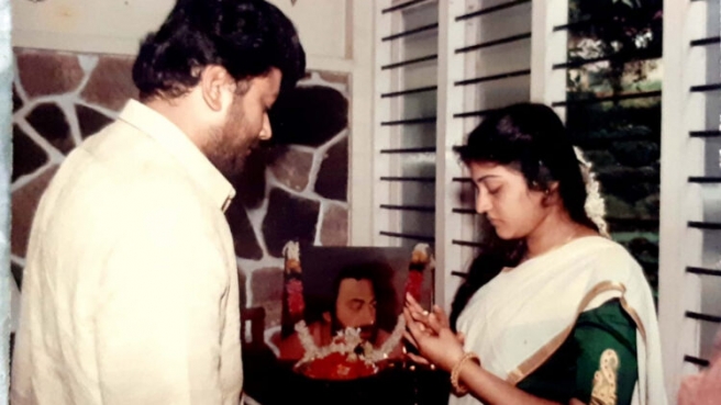 ജയറാമും പാർവ്വതിയും വിവാഹിതരാകുന്നതിന് മുൻപ് പത്മരാജന്റെ ചിത്രത്തിന് മുന്നിൽ നിന്നുകൊണ്ട് പരസ്പരം മോതിരം അണിയുന്ന ചിത്രങ്ങളാണിത്. തന്നെ സിനിമയിലേക്ക് കൈപിടിച്ചുയർത്തിയ സംവിധായകനോടുള്ള സ്നേഹപ്രകടനമായിരുന്നു അത്. ‘ പൊന്നിയിൽ സെൽവനി’ലെ ആഴ്വാർകടിയൻ നമ്പി എന്ന കഥാപാത്രത്തെ അവതരിപ്പിച്ച ജയറാമിനെ അഭിനന്ദിച്ചുകൊണ്ടാണ് ഇത് പങ്കുവെച്ചത്. ഒപ്പം ജയറാമുമായി നടത്തിയ ഫോൺ സംഭാഷണവും പങ്കുവെച്ചിട്ടുണ്ട്.