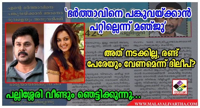 എന്റെ ഭര്ത്താവിനെ പങ്കുവയ്ക്കാന് അരേയും അനുവദിക്കില്ലെന്നും അങ്ങനെ വന്നാല് സിനിമയില് സജീവമാകുമെന്നും മഞ്ജു പറഞ്ഞു. പിന്നീട് തന്റെ ഭാര്യയായി തുടരുന്നിടത്തോളം നൃത്തവും അഭിനയവും സമ്മതിക്കില്ലെന്ന് ദിലീപ് പറഞ്ഞു. ഞാന് ഒന്നിനും പോകില്ല. ദിലീപേട്ടന്റെ ഭാര്യയായും അമ്മുവിന്റെ അമ്മയായും കഴിയാം. എന്നാല് അവള് നമുക്കിടയില് ഉണ്ടാകാന് പാടില്ലെന്നായിരുന്നു മഞ്ജുവിന്റെ ആവശ്യം. എന്നാല് ഞാന് ജീവിച്ചിരിക്കുന്നുവെങ്കില് അവള് ഉണ്ടാകുമെന്നും എനിക്ക് നിങ്ങള് രണ്ടു പേരും വേണമെന്ന് ദിലീപ് പറഞ്ഞതായും പല്ലിശ്ശേരി കുറിക്കുന്നു. അതിന് എന്നെ കിട്ടില്ലെന്ന് വ്യക്തമാക്കി മഞ്ജു ആലുവയിലെ വീട്ടില് നിന്നിറങ്ങിയെന്നും പല്ലിശ്ശേരി വെളിപ്പെടുത്തുന്നു.