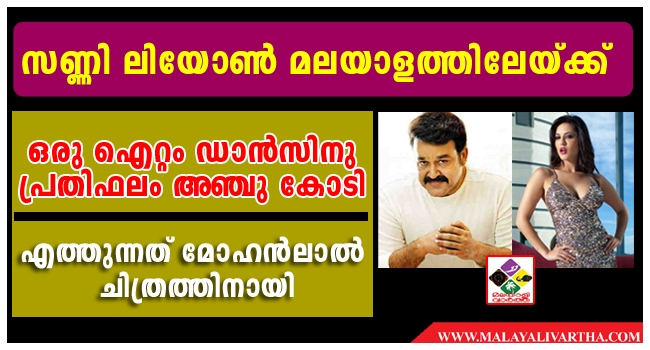 ബോളീവുഡ് താരവും മുന് നീലച്ചിത്ര നായികയുമായ സണ്ണി ലിയോണ് ഒരു ഐറ്റം ഡാന്സിനായി മലയാള സിനിമയില് എത്തുന്നു. ബി.ഉണ്ണികൃഷ്ണന് മോഹന്ലാല് ടീമിന്റെ ഏറ്റവും പുതിയ ചിത്രമായ വില്ലനിലെ പതിനഞ്ച് മിനിറ്റ് നീണ്ടു നില്ക്കുന്ന ഐറ്റം ഡാന്സിനായാണ് സണ്ണി ലിയോണ് മലയാളത്തിലേയ്ക്കു എത്തുന്നത്. വനിതാ ഫിലിം അവാര്ഡിനായി കഴിഞ്ഞ വര്ഷം കേരളത്തില് എത്തിയപ്പോഴാണ് ബി. ഉണ്ണികൃഷ്ണന് സണ്ണി ലിയോണുമായി ആദ്യ ഘട്ട ചര്ച്ച നടത്തിയിരുന്നത്. ഇതേ തുടര്ന്നാണ് വില്ലനിലെ ഐറ്റം ഡാന്സിനു വേണ്ടി സണ്ണി ലിയോണ് സന്നദ്ധത അറിയിച്ചത്. അഞ്ചു കോടി രൂപ പ്രതിഫലത്തിനൊപ്പം, വിമാന ചാര്ജും, ഹോട്ടല് റെന്റും നിര്മാതാവ് വഹിക്കണമെന്നാണ് ഇപ്പോഴുണ്ടായിരിക്കുന്ന ധാരണ.