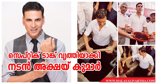 സ്വഛ് ഭാരത് അഭിയാന് പദ്ധതി; സെപ്റ്റിക് ടാങ്ക് വൃത്തിയാക്കി നടന് അക്ഷയ് കുമാര്