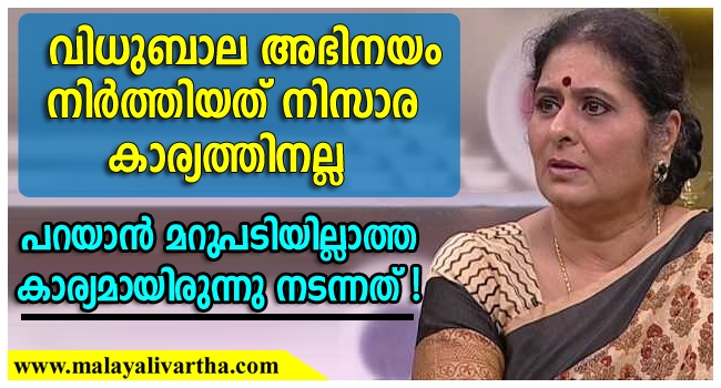 ഒരുകാലത്ത് മലയാള സിനിമയുടെ പ്രിയതാരമായിരുന്നു വിധുബാല. ഇന്നും ടെലിവിഷന് പരിപാടികളിലൂടെ അവര് മലയാളി പ്രേക്ഷകരുടെ മുമ്പിലെത്തുന്നു. എന്നാല് അഭിനയം നിര്ത്താനുണ്ടായ ആ പ്രത്യേക സാചര്യത്തേക്കുറിച്ചു വിധു ബാല പറഞ്ഞത് ഇങ്ങനെ.