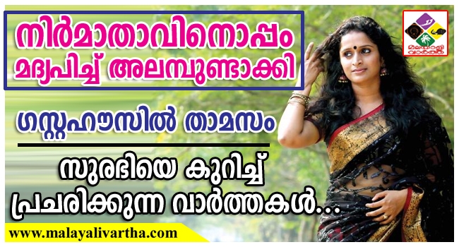 വിദാര്ത്ഥ് നായകനായി എത്തുന്ന വണ്ടി എന്ന തമിഴ് ചിത്രത്തിന്റെ എക്സിക്യുട്ടീവ് പ്രൊഡ്യൂസറാണത്രെ സുരഭി. ഷൂട്ടിങിന്റെ ആവശ്യവുമായി ബന്ധപ്പെട്ട് വടപളനിയിലെ ഒരു ഹോട്ടലിലാണ് ടീം അംഗങ്ങള് താമസിച്ചിരുന്നത്. ഹോട്ടിലില് നിര്മാതാവയ മുഹമ്മദ് നസീറിനൊപ്പം സുരഭി മദ്യപിച്ചു ബഹളമുണ്ടാക്കിയത്രെ. വടപളനിയിലുള്ള ഒരു ഹോട്ടലില് വച്ചാണ് സംഭവം. മദ്യപിച്ച് ബഹളമുണ്ടാക്കിയതിനെ തുടര്ന്ന് സുരഭിയെയും മുഹമ്മദ് നസീറിനെയും ഹോട്ടല് മാനേജര് ഇറക്കിവിട്ടു. ഇപ്പോള് വളസര്പ്പക്കം എന്ന സ്ഥലത്ത് ഒരു ഗസ്റ്റ് ഹൗസിലാണ് ഇരുവരും താമസിക്കുന്നത് എന്നൊക്കയാണ് ഈ മാഗസിന് വാര്ത്തയില് പറയുന്നത്.