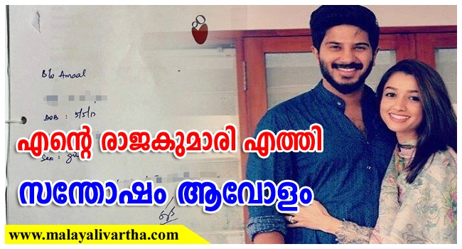 'ഒന്നിലേറെ കാരണങ്ങളാല് ഇന്നെനിക്ക് മറക്കാനാകാത്ത ദിവസമാണ്. എന്റെ ജീവിതം തന്നെ മാറിമറിഞ്ഞിരിക്കുന്നു. സ്വര്ഗത്തില് നിന്നും വലിയൊരു അനുഗ്രഹം ലഭിച്ചിരിക്കുന്നു. എന്റെ വളരെക്കാലത്തെ ആഗ്രഹം സഫലീകരിച്ചു. എനിക്ക് എന്റെ രാജകുമാരിയെ ലഭിച്ചു.' ദുല്ഖര് ഫെയ്സ്ബുക്കില് പോസ്റ്റ് ചെയ്തു.