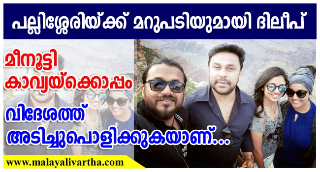 യുസ്സില് വച്ച് നടന്ന ദിലീപ് ഷോയ്ക്ക് പോകുമ്പോള് മകളെ ഹോസ്റ്റലിലാക്കി എന്നും കാവ്യയ്ക്കൊപ്പം വിദേശത്ത് അടിച്ചു പൊളിക്കുകയാണ് ദിലീപ് എന്നുമൊക്കെയായിരുന്നു വാര്ത്തകള്. എന്നാല് പല്ലിശ്ശേരിയ്ക്കുള്ള മറുപടിയെന്നോണം ഇപ്പോള് സോഷ്യല് മീഡിയയില് ഒരു ഫോട്ടോ പ്രചരിയ്ക്കുന്നുണ്ട്. ആ ഫോട്ടോ കണ്ട് തീരുമാനിക്കാം എല്ലാം..