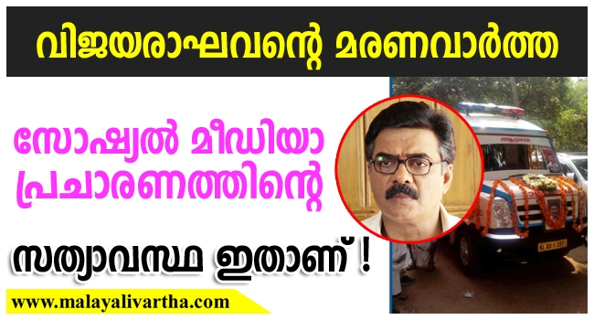 ഇന്നലെ വൈകിട്ടു മുതലാണ് നടന് വിജയരാഘവന് അന്തരിച്ചെന്ന വ്യാജവാര്ത്ത സാമൂഹിക മാധ്യമങ്ങളില് പ്രചരിക്കുന്നത്. 'മൃതദേഹം' കൊണ്ടുപോകുന്ന ആംബുലന്സിന്റെ ചിത്രം എന്ന പേരില് ഒരു ഫോട്ടോ സഹിതമാണ് വാര്ത്ത വ്യാപകമായി പ്രചരിക്കുന്നത്.
