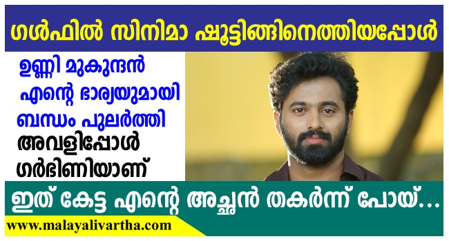 സര്, എന്റെ ഭാര്യയുമായി നിങ്ങളുടെ മകന് പ്രണയത്തിലാണ്. ഗള്ഫില് സിനിമാ ഷൂട്ടിങ്ങിനെത്തിയപ്പോള് അവളുമായി ബന്ധം പുലര്ത്തി. അവളിപ്പോള് ഗര്ഭിണിയായി. ഭര്ത്താവെന്ന നിലയില് പലവട്ടം വിലക്കി. എറണാകുളത്ത് അവളുമായി നടക്കുന്നതറിഞ്ഞ് അവനെ ഭീഷണിപ്പെടുത്തുന്നതിന് ഞാന് ഗുണ്ടയെ വിട്ടു. പക്ഷേ, 30,000 രൂപ നല്കി അവന് ഗുണ്ടയെ ഒതുക്കി. അച്ഛന് തകര്ന്നുപോയി. മകനെ വിളിച്ചു. മകന് മറ്റാരുമല്ല നമ്മുടെ ഇഷ്ടനടന് ഉണ്ണി മുകുന്ദന്. ഇനി കാര്യങ്ങള് ഉണ്ണി മുകുന്ദന് പറയും: