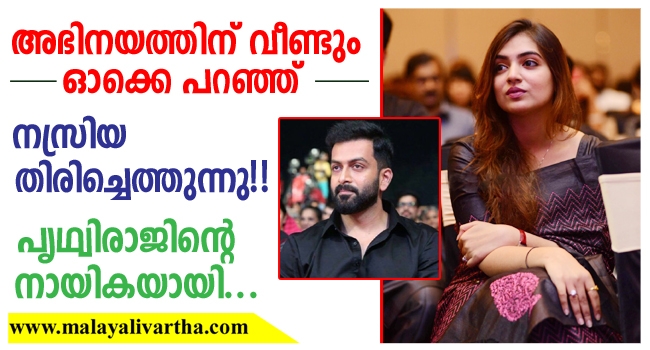 നസ്രിയ തിരിച്ചെത്തുന്നു; പൃഥ്വിരാജിന്റെ നായികയായി