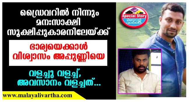 ദിലീപിന് ഭാര്യയായ കാവ്യയെക്കാള് വിശ്വാസം അപ്പുണ്ണിയെ ആണെന്നാണ് സിനിമരംഗത്ത് പറഞ്ഞുകേള്ക്കുന്നത് . ഒരർത്ഥത്തിൽ സത്യമാണ് താനും. അപ്പുണ്ണി ദിലീപിന്റെ ഡ്രൈവറായി എത്തുന്നത് ആറുവര്ഷം മുമ്പ്. അപ്പുണ്ണിയുടെ സഹോദരനായ ഷൈജുവാണ് സിനിമാമേഖലയുമായി ആദ്യം ബന്ധപ്പെടുന്നത്. ലൊക്കേഷനുകളില് ഡ്രൈവറായിരുന്ന ഷൈജു വിവാഹത്തിന് ശേഷം അപ്പുണ്ണിയെയും സിനിമയിലെത്തിച്ചു.