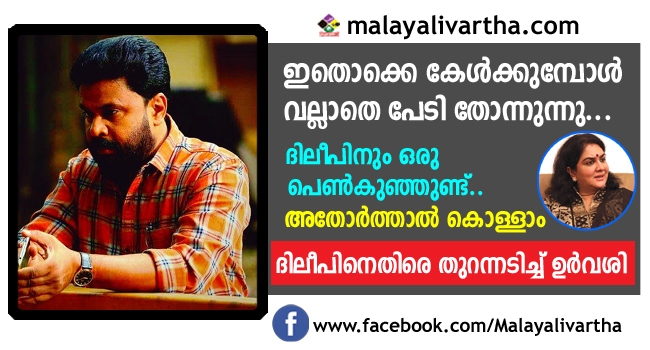 ഇതിലാണ് ദിലീപിനെതിരെയും മലയാള സിനിമയ്ക്കെതിരെ ഉര്വശി തുറന്നടിയ്ക്കുന്നത്. ഓഡിയോയില് പറയുന്നതിലേറെയും മലയാള സിനിമയിലെ ഇന്നത്തെ അവസ്ഥയെപ്പറ്റിയാണ്. ദിലീപിനെതിരായ പരാമര്ശം ഇങ്ങനെ- ഇതൊക്കെ കേള്ക്കുമ്പോള് (നടിയെ ആക്രമിച്ചത്) വല്ലാതെ പേടി തോന്നുന്നു. ഇത്രയും നാള് ഇതേ കുറിച്ചൊന്നും പ്രതികരിക്കാതിരുന്നത്, ഞാന് അല്പം ഇമോഷണലാണ്.