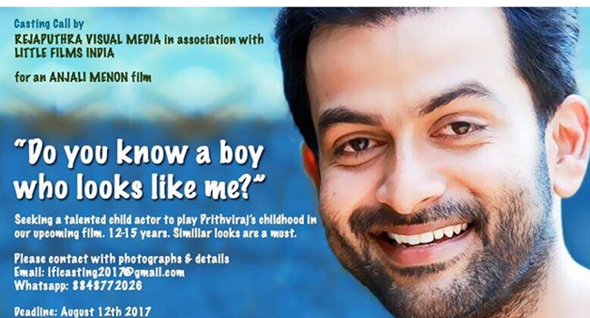പൃഥ്വിരാജിന്റെ പുതിയ ചിത്രത്തില് അഭിനയിക്കാന് ആണ്കുട്ടിയെ തേടുന്നു. 12-15 വയസ്സ് വരെ പ്രായമുള്ള ആണ് കുട്ടിയെയാണ് വേണ്ടത്. പൃഥ്വിരാജ് അവതരിപ്പിക്കുന്ന കഥാപാത്രത്തിന്റെ ബാല്യകാലം അവതരിപ്പിക്കാനാണ് കുട്ടികളെ തോടുന്നത്.