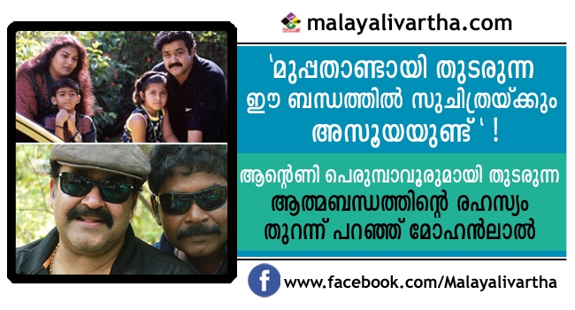 'എന്റെ കല്ല്യാണം കഴിഞ്ഞിട്ട് 29 വര്ഷമായി. എനിക്ക് എന്റെ ഭാര്യയെയും ആന്റണിയെയും എനിക്ക് ഒന്നിച്ചാണ് കിട്ടിയത്. എനിക്ക് അവരേക്കാള് സ്നേഹം ആന്റണിയോടാണെന്ന് ഒരുപക്ഷേ, ഭാര്യയ്ക്ക് തോന്നിയിട്ടുണ്ടാകും. അവര്ക്ക് അതില് അസൂയയുണ്ട്. കാരണം കൂടുതല് സമയവും ഞാന് ആന്റണിയുടെ കൂടെയാണ് സഞ്ചരിക്കുന്നതും കഴിയുന്നതുമെല്ലാം. ഇപ്പോള് ഞാന് ധൈര്യമായി പറയുന്നു എന്റെ സിനിമാ കരിയറിലെ എല്ലാ ഉയര്ച്ചയുടെയും എന്റെ എല്ലാ നന്മയുടെയും പിറകില് ആന്റണി പെരുമ്ബാവൂര് എന്നൊരു വ്യക്തിയുണ്ട്. അത് സത്യമാണ്. ആ സത്യത്തെ ഞാന് മാനിക്കുന്നു. എന്റെ അവസാനശ്വാസം വരെ ആന്റണി കൂടെയുണ്ടാകും എന്നാണ് എന്റെ വിശ്വാസം'-മോഹന്ലാല് പറഞ്ഞു.