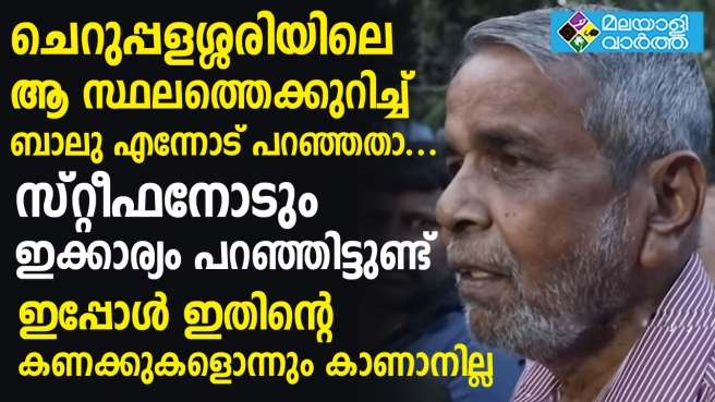 അദ്ദേഹത്തിന്റെ വാക്കുകൾ ഇങ്ങനെ... 'ചെറുപ്പളശ്ശരിയില് 50 സെന്റ് സ്ഥലം വാങ്ങിയിട്ടുണ്ടെന്ന് എന്നോട് ബാലു പറഞ്ഞിട്ടുണ്ട്. സ്റ്റീഫനോടും ഇക്കാര്യം പറഞ്ഞിട്ടുണ്ട്. അതിന്റെയൊന്നും കണക്കുകള് ഇപ്പോള് കാണാനില്ല. എനിക്ക് വയസുകാലത്തുണ്ടായിരുന്ന ആകെയുള്ള ഊന്നുവടിയായിരുന്നു. തരാന് എന്റെ കൈയില് തെളിവുകളൊന്നുമില്ല,